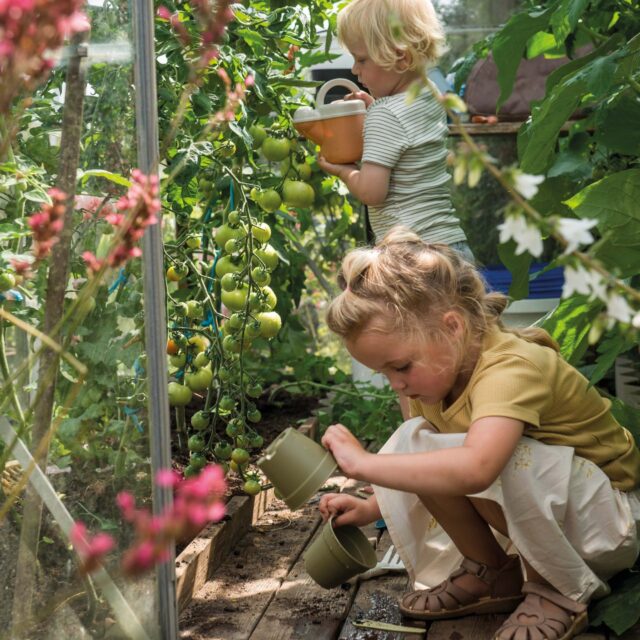 • 3D printet houses with grass on the roof and a lot of plants around